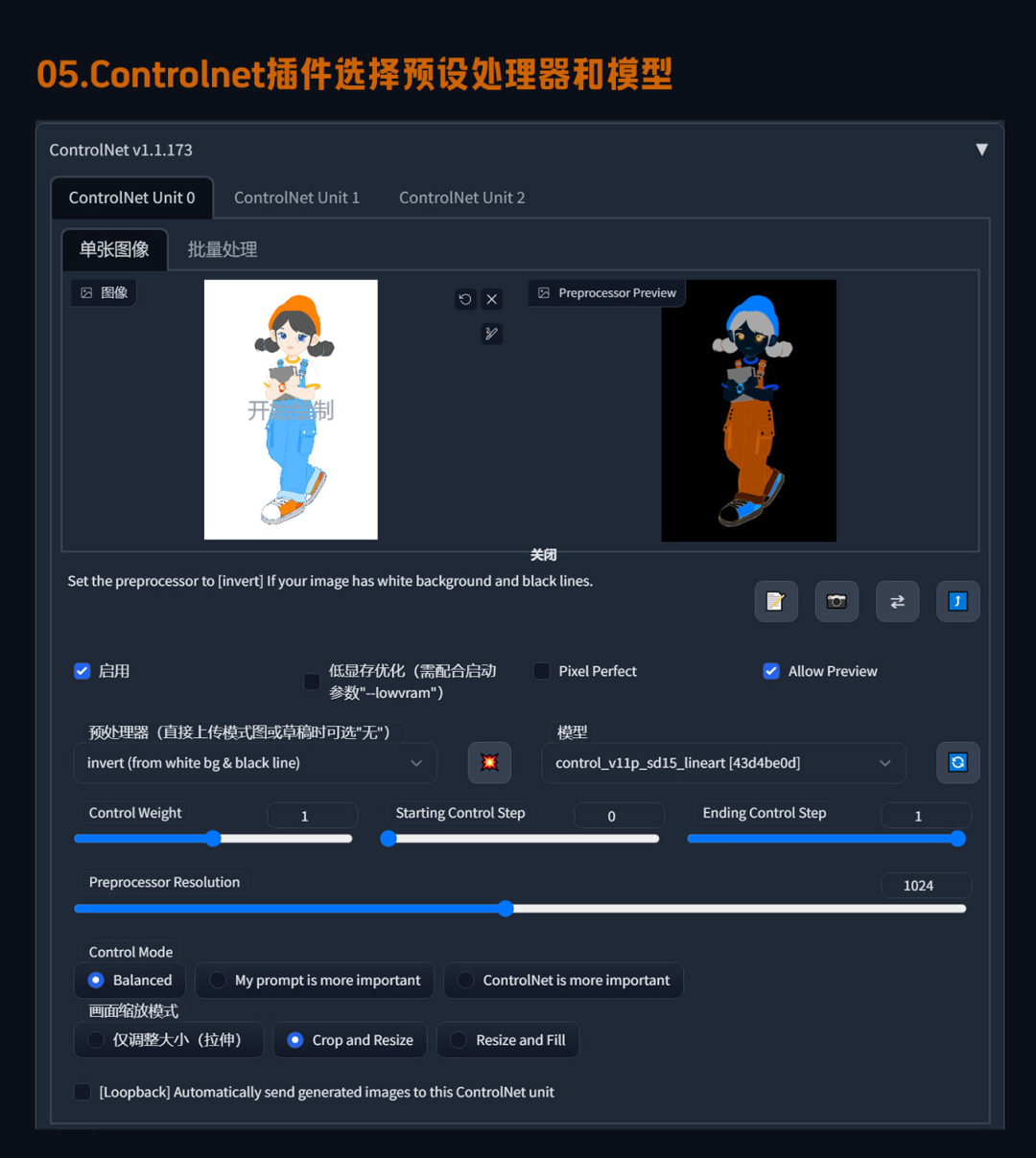 预处理器:invert(图像有白色背景和黑色线条建议选择invert)