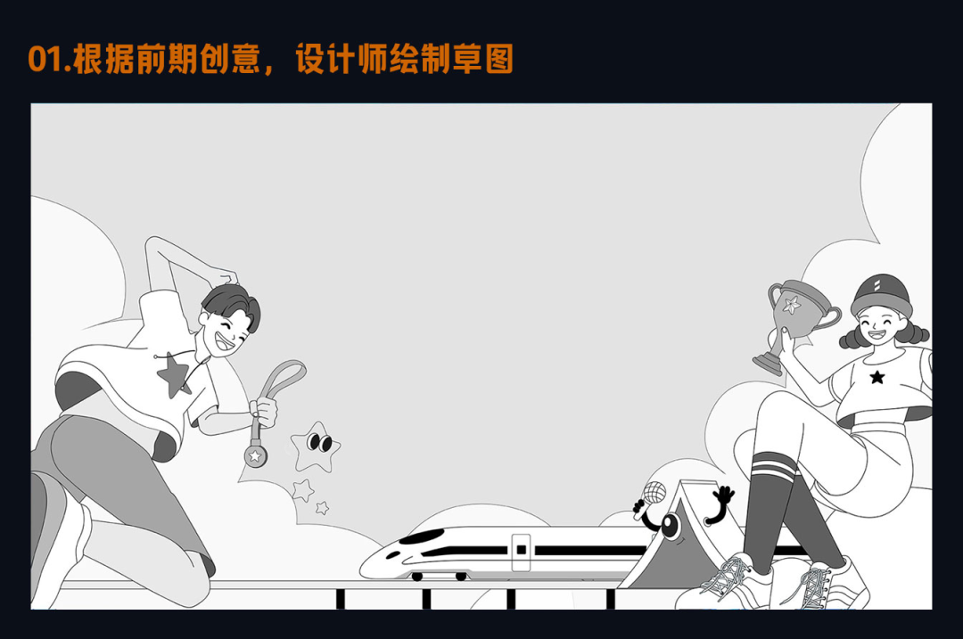 :采用左右对称布局,画面中央火车飞速驰过,而员工手握奖杯,面露开心激动之情,为整个场景营造氛围感。