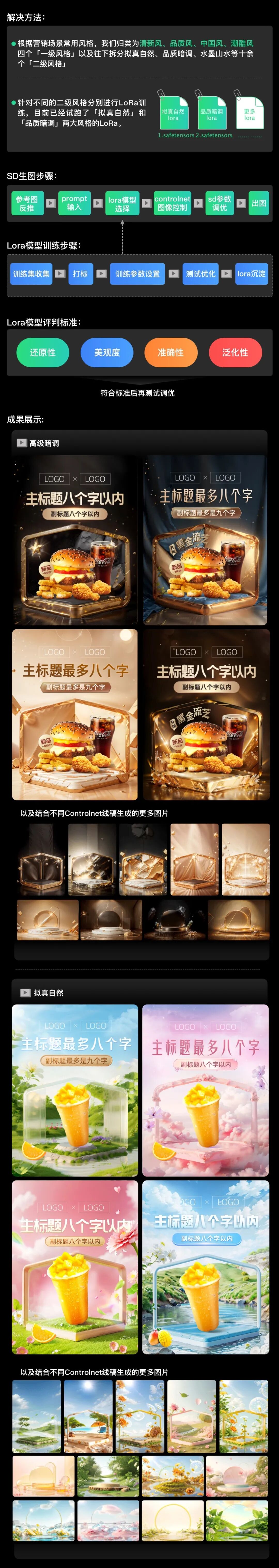 我们结合营销场景,对清新风、品质风、中国风、潮酷风四大风格下的拟真自然、品质暗调、水墨山水等十余个二级风格进行了 Lora 训练,使得这些风格的 Lora 模型更加精准、高效,符合我们的使用预期。