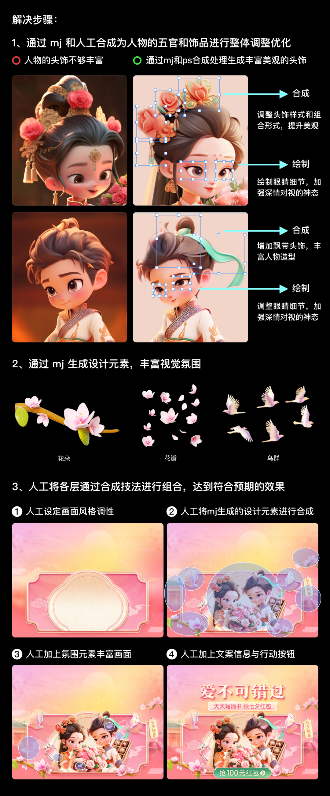 和第1个案例类似,MJ 生成的人物图像如不能直接满足我们的诉求,我们也可以继续采用 PS合成+绘制 的手法,为人物的发饰添加和调整细节,并对五官的刻画进行调整,使其表情更加传神。
