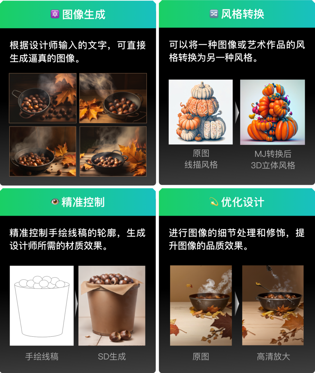 从设计师们的回答中可以明显看出,大家普遍对 AIGC 的到来秉持着积极的态度,认为 AIGC 已经展现出了强大的能力,助推设计师高效工作,以下是我们列举的几项在营销场景下,AIGC 可以带来的助力。