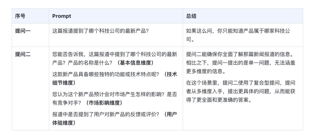 通过复合型提问,提问者可以让 AI 从不同的维度来回答问题,从而得到更全面、更深入、更准确的答案。