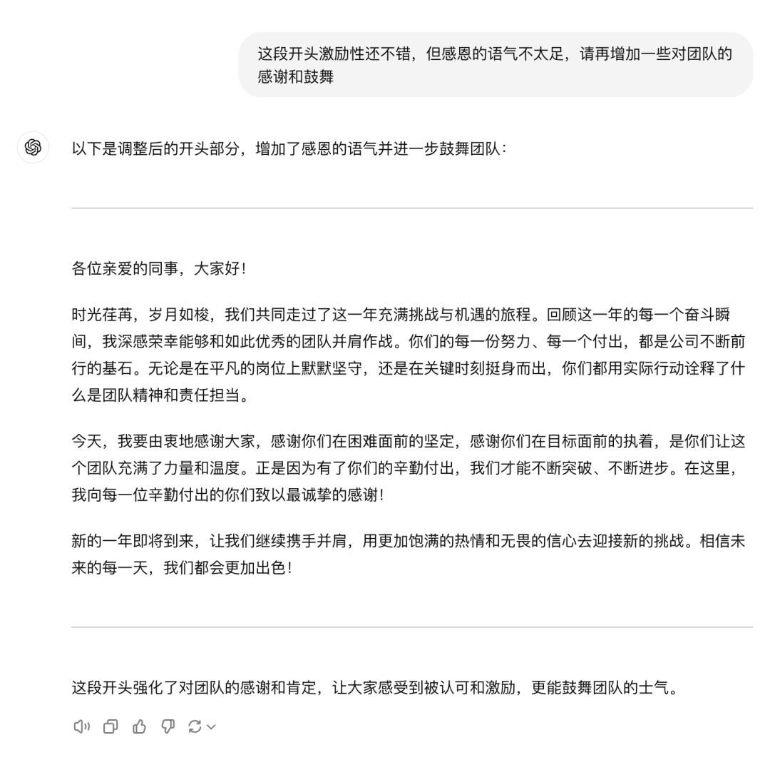 又或者,在年底总结会议前,你需要准备一份发言稿,但不知道如何开头,也可以找 AI 帮忙。