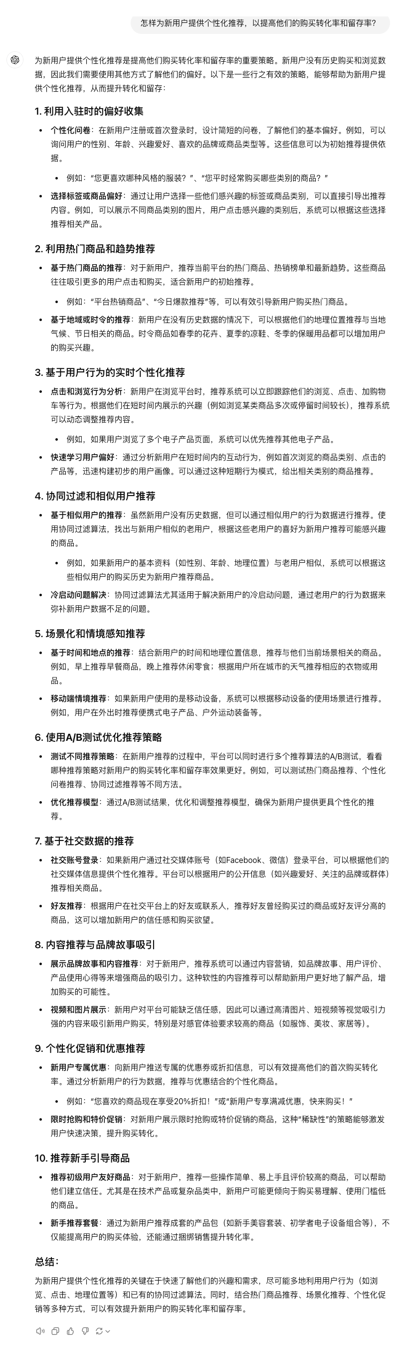 怎样为新用户提供个性化推荐,以提高他们的购买转化率和留存率?