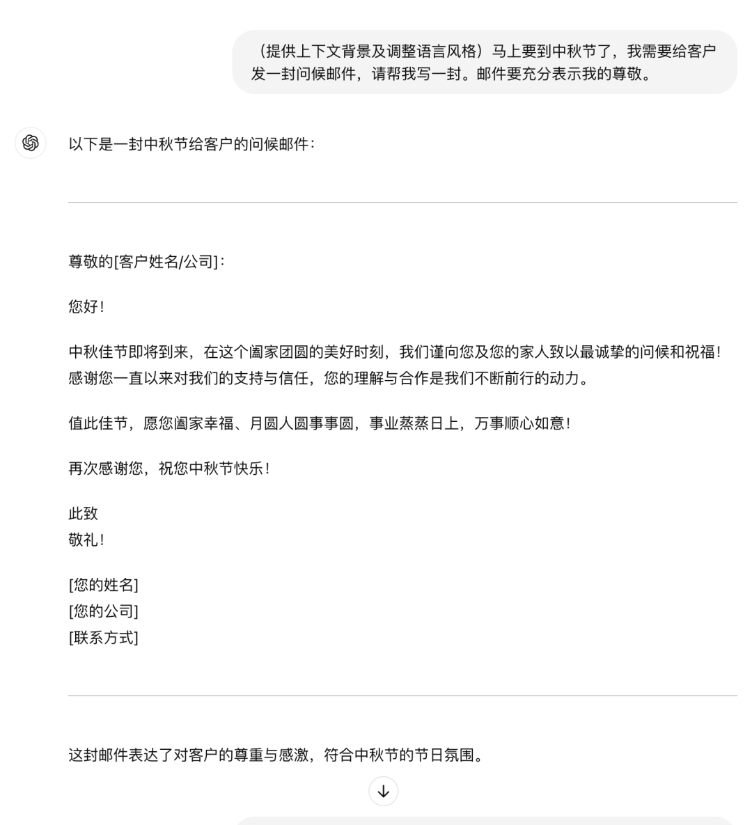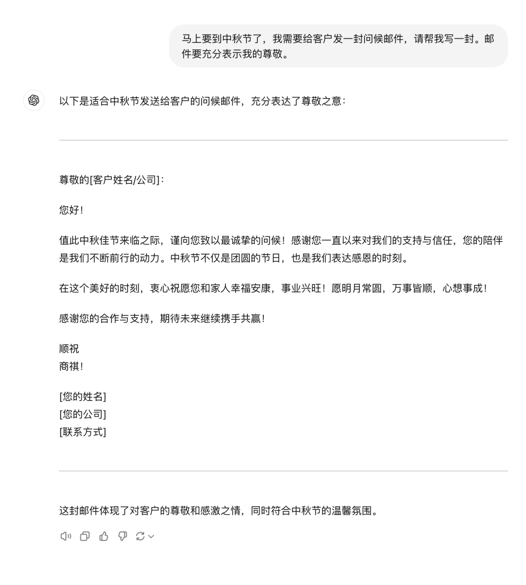 例如,中秋节前,你要给客户发送一封问候邮件,但不知道该怎么说,这时候就可以找 AI 帮忙。