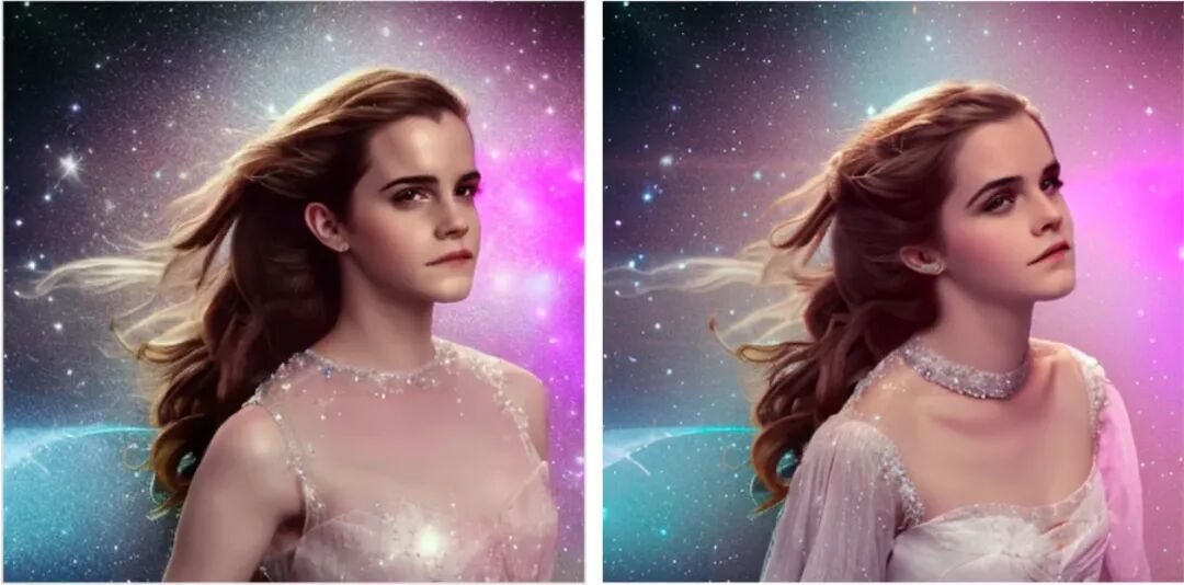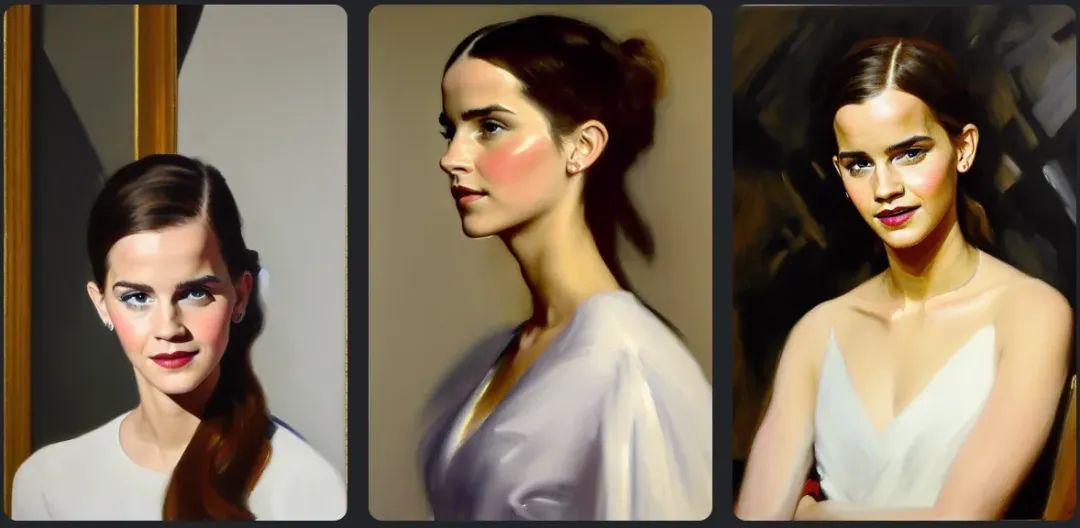 没错,这两位并不是真人,而是由 AI 一键生成的,毫无违和感!你可能会想这有什么了不起的,随手一搜就有好几 G 嘛。这项技术的有趣之处在于,还可以让模型生成一些先前不存在具有组合元素的高质量图像。比如说,你可以生成不同画家风格的明星照片,下面以 19 世纪印象派画家 Vincent van Gogh 和 19 世纪美国画家画家 John Sargent 风格来画下 Emma Watson 肖像画(Emma Watson 是《哈利波特》中赫敏的饰演者)