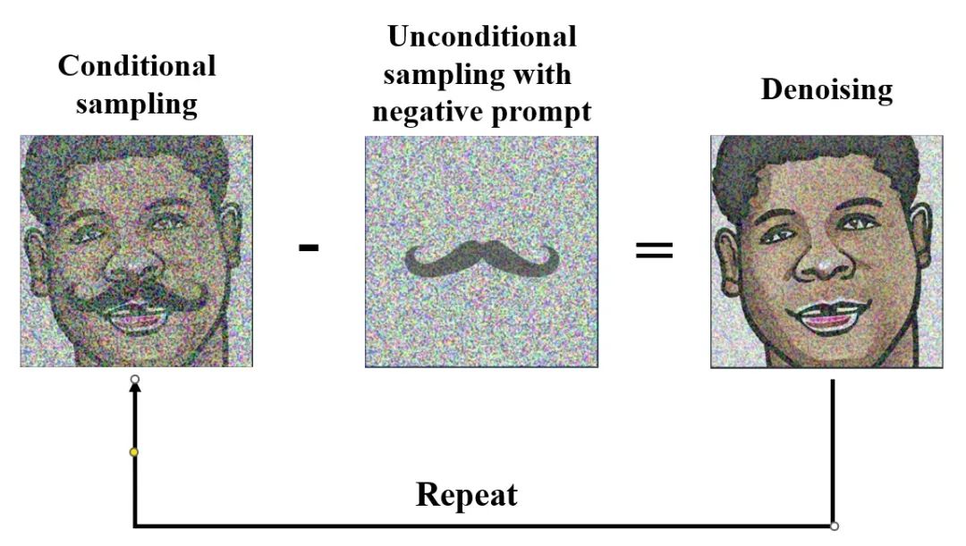 负面提示词是通过影响无条件采样实现的。利用负面提示词,在上面第 ② 步里就不是使用空提示来生成随机对象了。从技术上说,正面提示词会引导采样过程生成与文本相关的图像,负面提示词则会在采样过程来引导远离相关图像。需要说明,扩散过程是发生在隐空间 latent space 里,而不是图像空间,这里仅作为技术示意。
