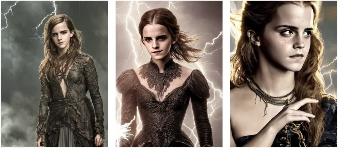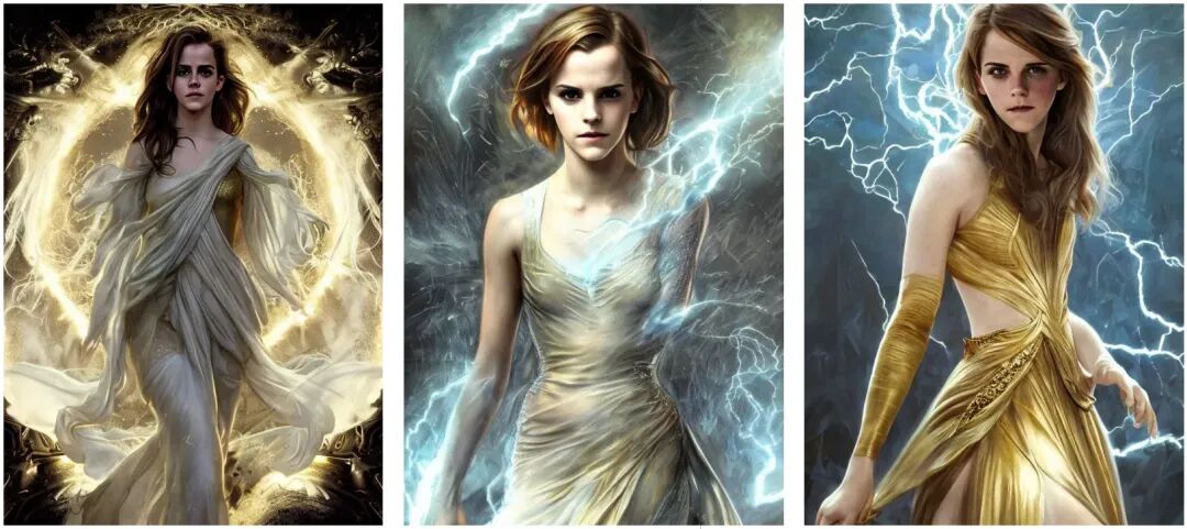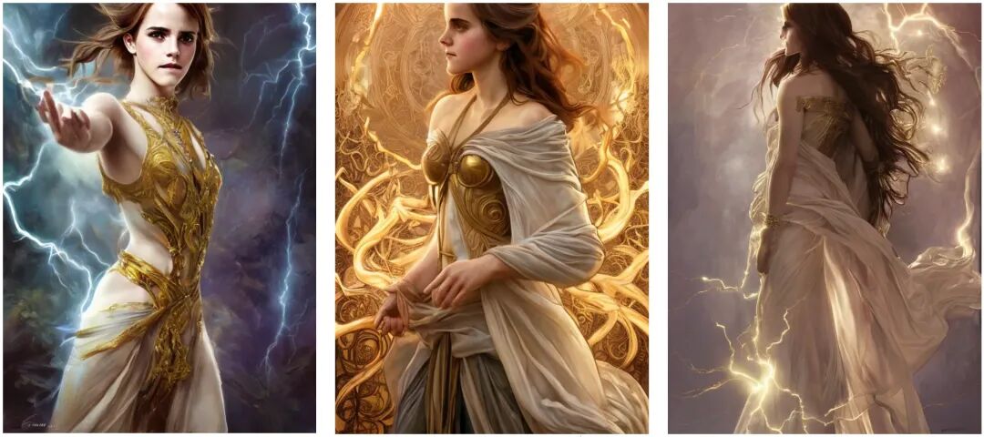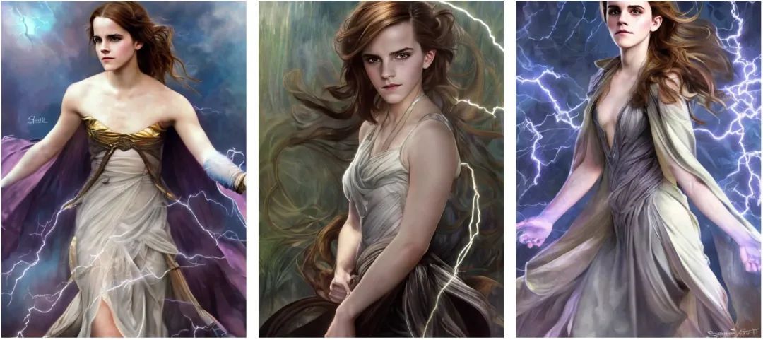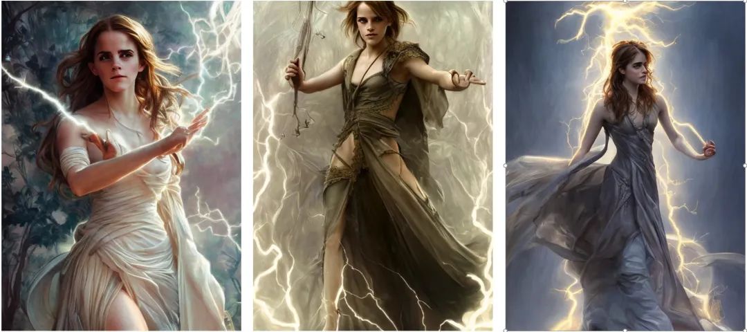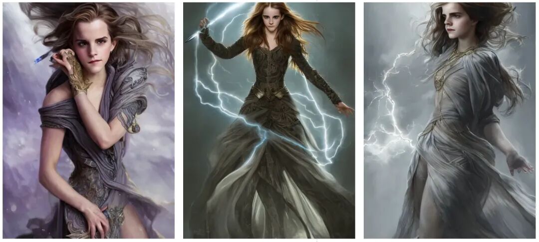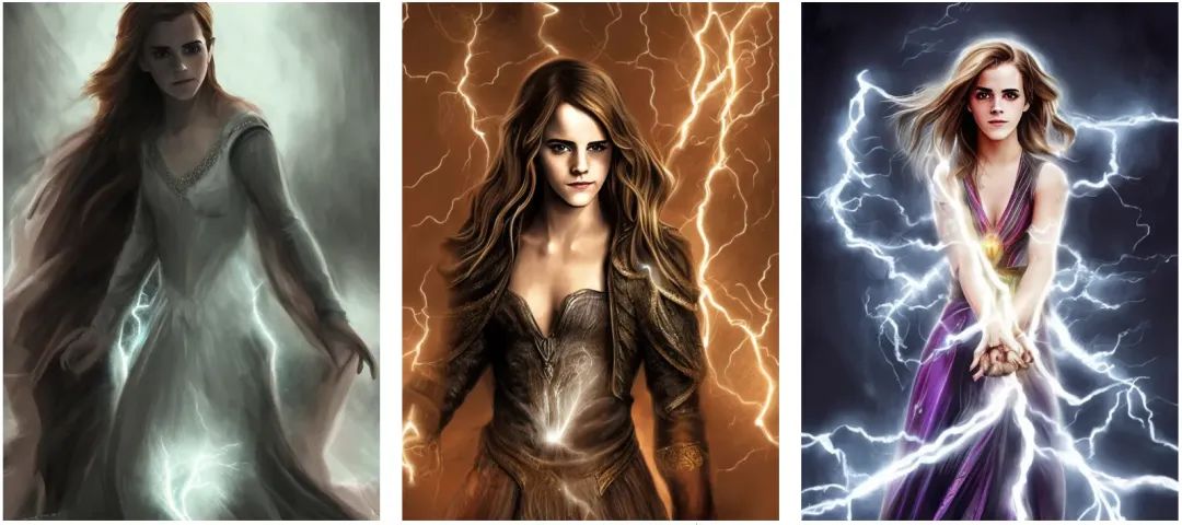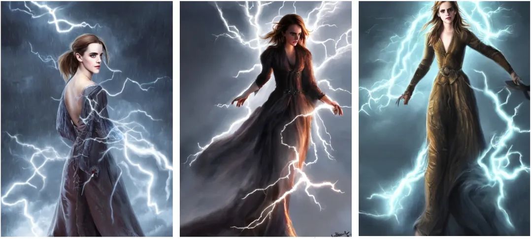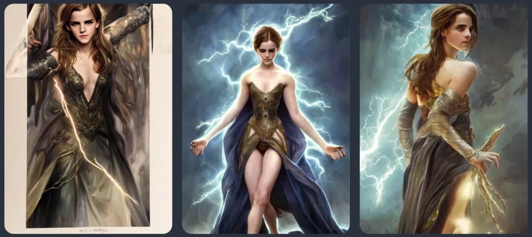 作为演示,把女巫形象设置成 Emma Watson 的样子,她因饰演《哈利波特》中的赫敏一角红遍全球,也是 stable diffusion 里最常使用的一个关键词。把她想象成一个会使用闪电的神秘女巫,并增加一些形象要求,提示词如下: