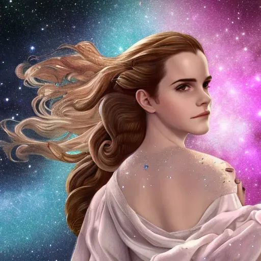emma watson as nature magic celestial, top down pose, long hair, soft pink and white transparent cloth, space, D&D, shiny background, intricate, elegant, highly detailed, digital painting, artstation, concept art, smooth, sharp focus, illustration, artgerm, bouguereau
