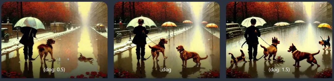下面这个例子调整了关键字“dog”的权重值。如下图所示,增大“dog”权重一般会生成更多狗,减少权重则降低了生成狗的数量。这种技术也可以应用到风格 style 或者光照 lighting 调整。