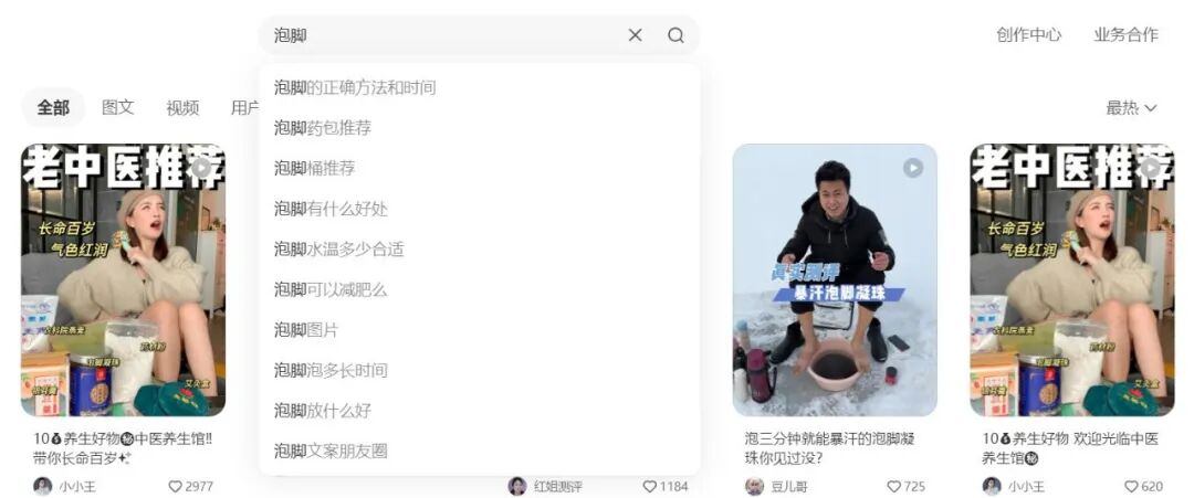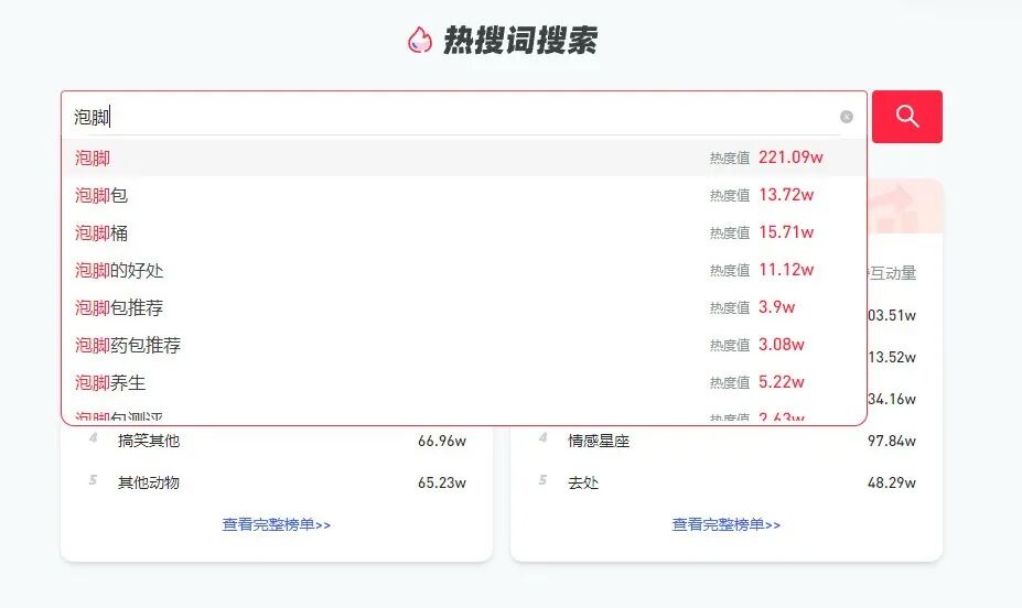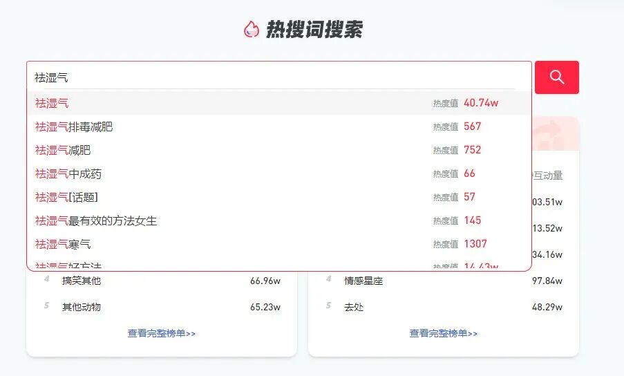 根据②步的热搜词,再打开新红数据,找到热搜词搜索,然后以词推词,并用表格记录这些热搜词的热度值,排列出最重要的10个关键词。如:泡脚、泡脚包、泡脚的好处、泡脚凝珠、祛湿气、祛湿气好方法等。