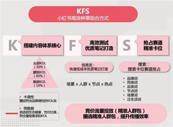 小红书营销推崇反漏斗模型,通俗一点讲,就是要先聚焦到一撮人,然后针对这一撮人生产爆款内容。同时通过K博主(KOL带动产品或品牌声量)、F自然流(快速低成本优质笔记打造)、S搜索流(用关键词卡位进行赛道抢占)。