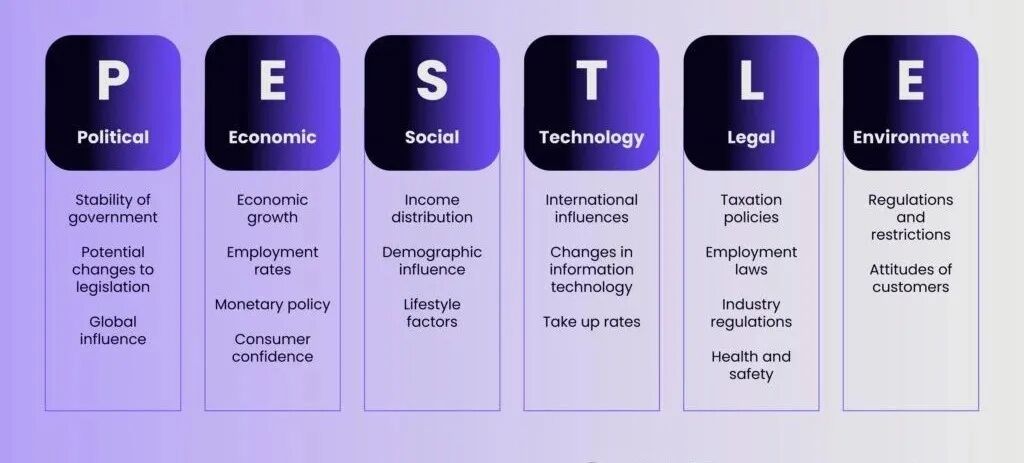 涉及政府政策、政治稳定性、政府对特定行业的态度、贸易限制、税法等。政治环境的稳定性和政府的政策变化可以显著影响企业的运营和战略决策。