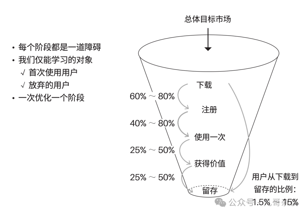 用户漏斗模型大家会更熟悉一些,漏斗的顶端是总目标市场,即所有潜在用户。漏斗的底部是留存用户。