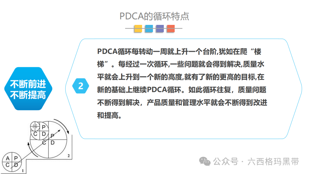 PDCA循环不是在同一水平上循环,而是每次循环都能取得一定的成果,推动工作前进一步,水平提高一步。这种不断前进、不断提高的特点,激发了组织的内在动力和活力,使得组织能够在激烈的市场竞争中保持领先地位。