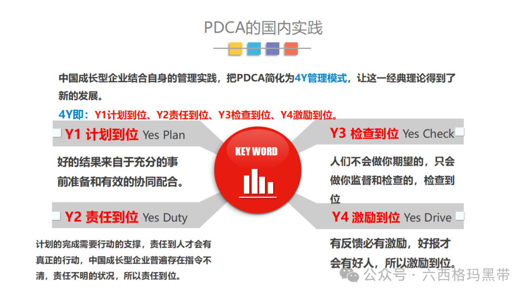 在国内,PDCA循环被广泛应用于各种管理实践中,并形成了具有中国特色的管理模式。其中,4Y管理模式(Y1计划到位、Y2责任到位、Y3检查到位、Y4激励到位)便是其中的典型代表。