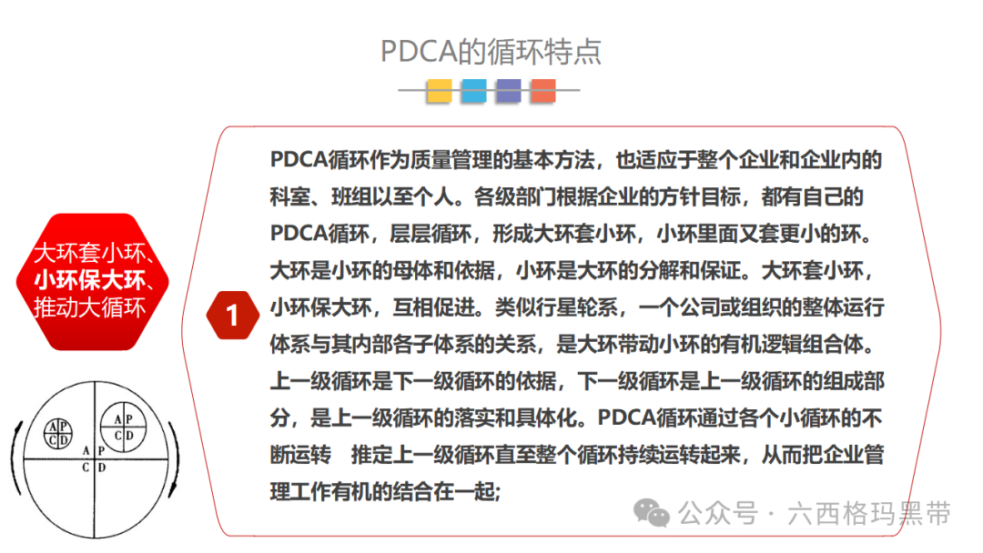PDCA循环不仅适用于组织层面,也适用于各级部门和个人。各级部门根据企业的总体目标,制定自己的PDCA循环计划,形成大环套小环、层层循环的体系。这种体系确保了组织上下一心,共同推动目标的实现,同时也促进了各部门之间的协同与配合。