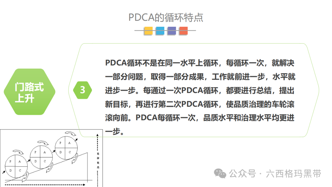 每转动一周PDCA循环,组织就会上升一个台阶。通过不断的循环迭代和持续改进,组织能够逐步解决存在的问题,提升管理水平和业务能力,从而推动质量水平的不断提升。这种门路式上升的特点,使得PDCA循环成为组织追求卓越、持续进步的有力工具。