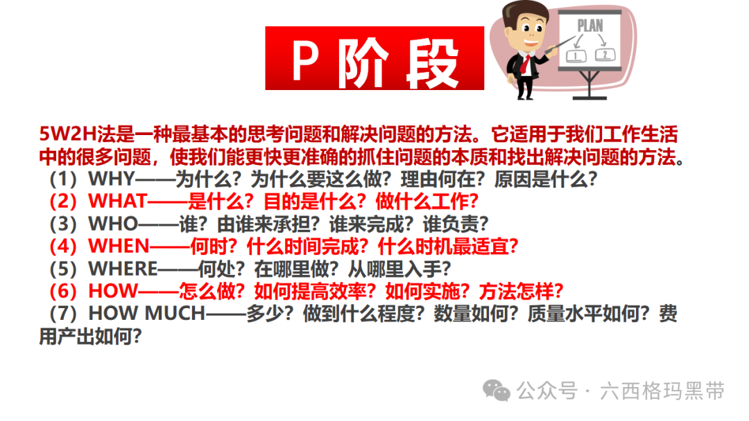 5W2H法:通过回答七个关键问题(什么、为什么、谁、何时、哪里、如何、多少),全面梳理计划细节,确保计划的完整性和可行性。