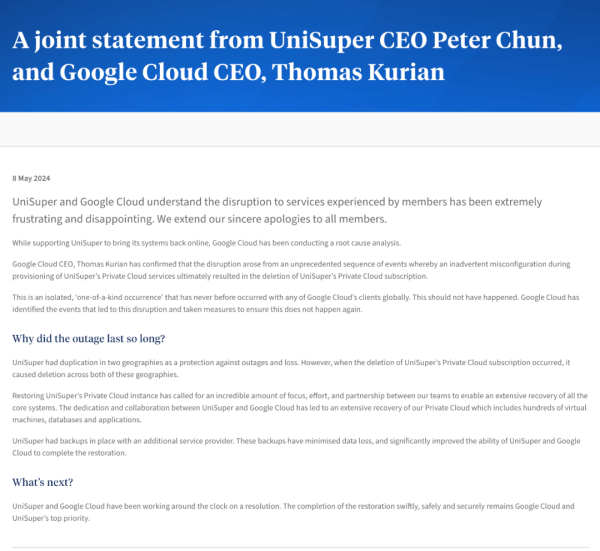 近日,超大基金UniSuper老板和谷歌云全球首席执行官发表了一份联合声明,为“极其令人沮丧、极其令人失望”的故障事件道歉。
